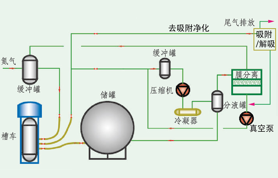 儲罐卸壓排放氣或汽車卸凈后的尾氣經(jīng)緩沖罐后,進(jìn)入壓縮/冷凝,然后通過氣液分離罐將液相產(chǎn)品分離出去。分液罐的不凝氣進(jìn)入膜分離系統(tǒng),滲透氣和真空解吸氣返回到壓縮機(jī)入口:膜分離系統(tǒng)的尾氣為提濃氮氣,非甲烷烴低于15q/㎡送至氮氣緩沖罐或進(jìn)一步送吸附凈化<60mg/m,油氣總烴回收率大于97%。