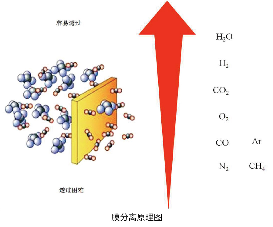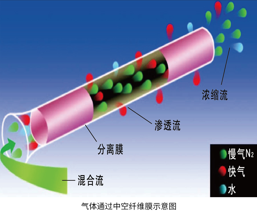 空氣中的氮?dú)夂脱鯕庠谀蓚?cè)壓力差的作用下,由于它們?cè)谀ぶ械娜芙舛群蛿U(kuò)散系數(shù)的不同,導(dǎo)致滲透速率較快的水蒸氣、氧氣等氣體優(yōu)先透過膜,成為富氧氣體;而滲透速率較慢的氮?dú)庠跍魝?cè)富集,成為干燥的富氮?dú)怏w。
